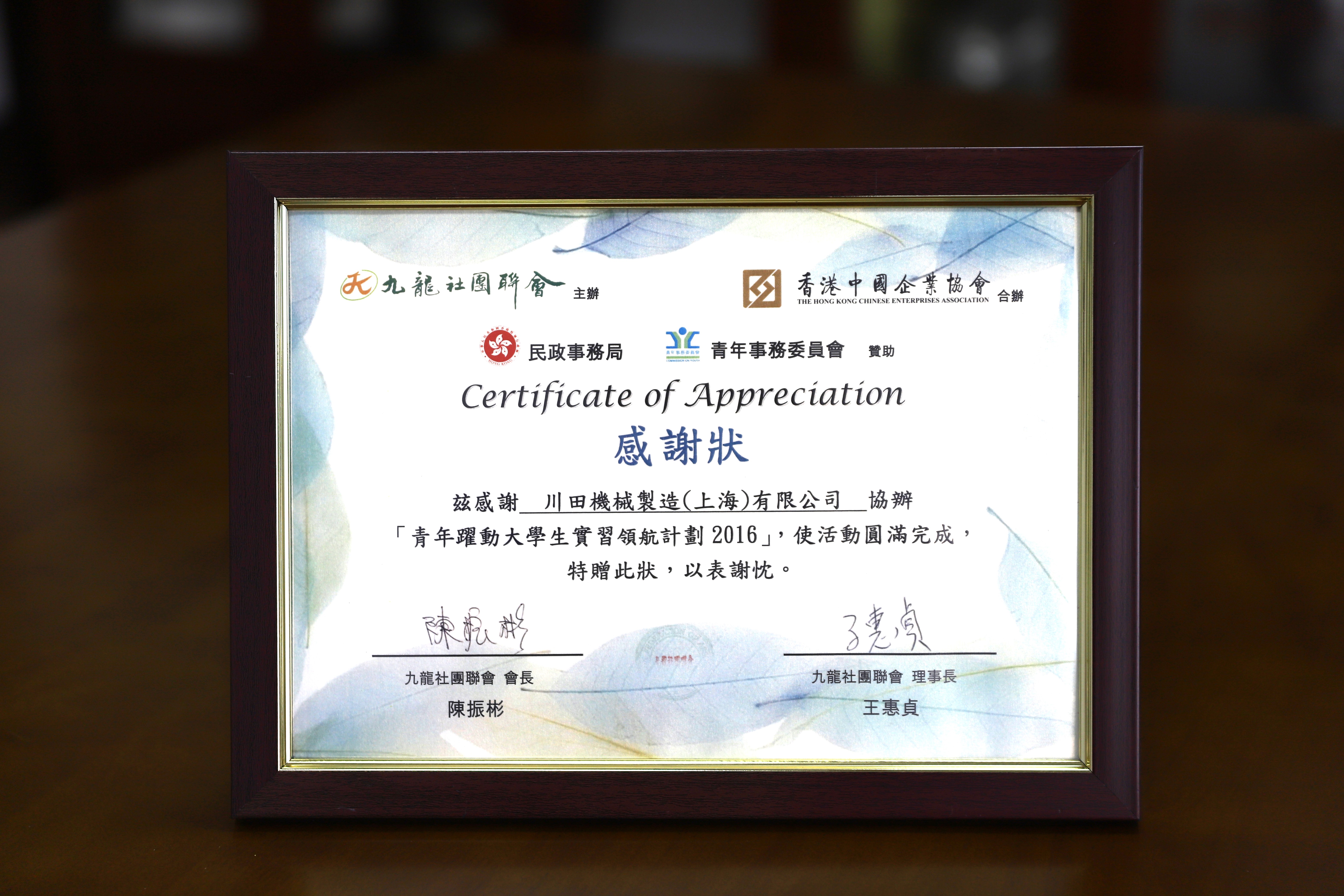 2016 青年悅動大學(xué)生實習(xí)領(lǐng)航計劃感謝狀